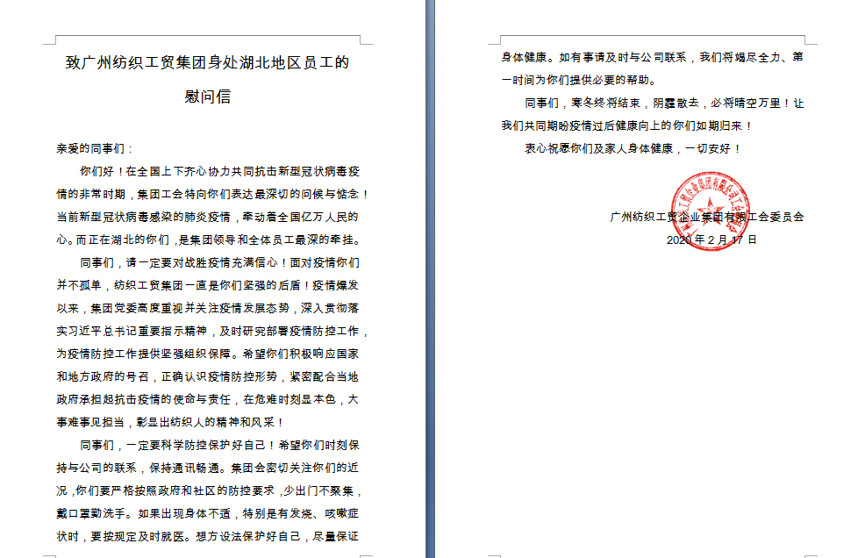集團工會自2月17日發(fā)出《廣州紡織工貿(mào)集團湖北籍及身處湖北地區(qū)員工的慰問信》,向9名身處湖北地區(qū)的員工們轉(zhuǎn)達了集團領(lǐng)導和全體員工對疫區(qū)同事最深的牽掛,鼓勵他們要充滿信心,一定能戰(zhàn)勝疫情,后方溫暖大集體是他們的依靠,等著他們安全歸來!